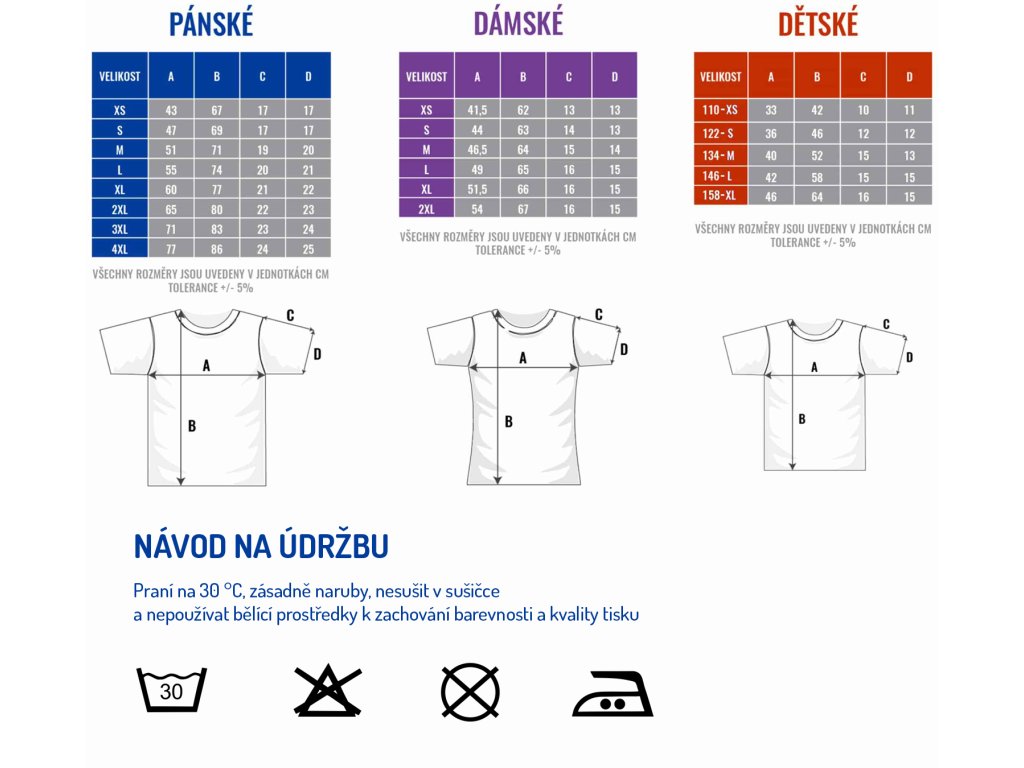 Návod k údržbě: Praní na 30 °C, zásadně naruby, nesušit v sušičce a nepoužívat bělící prostředky k zachování barevnosti a kvality tisku